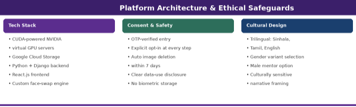 Ethical design was not a layer added afterwards. It was built into the system’s core. Entry required OTP verification via mobile, ensuring explicit, deliberate consent before any facial data was processed. Users selected their preferred language, Sinhala, Tamil, or English, and their preferred gender variant for the narrative. All uploaded images were automatically deleted within seven days, and clear in-platform communication explained exactly how the AI worked and what would happen to user data.