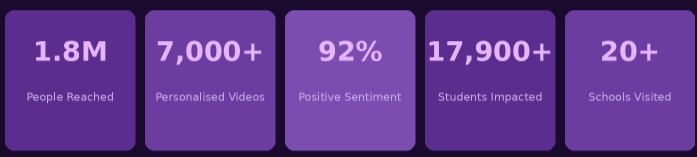 The campaign reached 1.8 million people across Meta and YouTube, generating over 5 million impressions. More than 7,000 personalized mentorship videos were created. Of these, 509 were eligible for the share-to-donate mechanic, resulting in 1,527 girls receiving pad packs directly through the HER Foundation. Social listening recorded 92% positive sentiment from campaign-related engagement. The campaign also triggered partnerships with the Lions Club of Galle, the Saheli Foundation, and Parenthrive, extending reach to a further 2,000 girls and mothers.